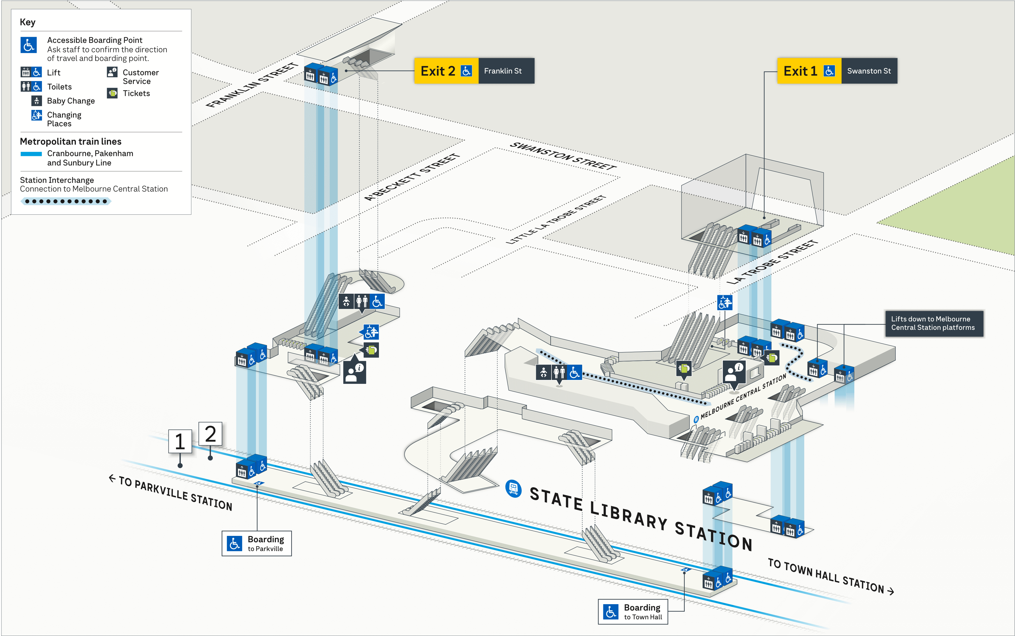 – Two entrances at the new Domain train/tram interchange directly above the station on St Kilda Road