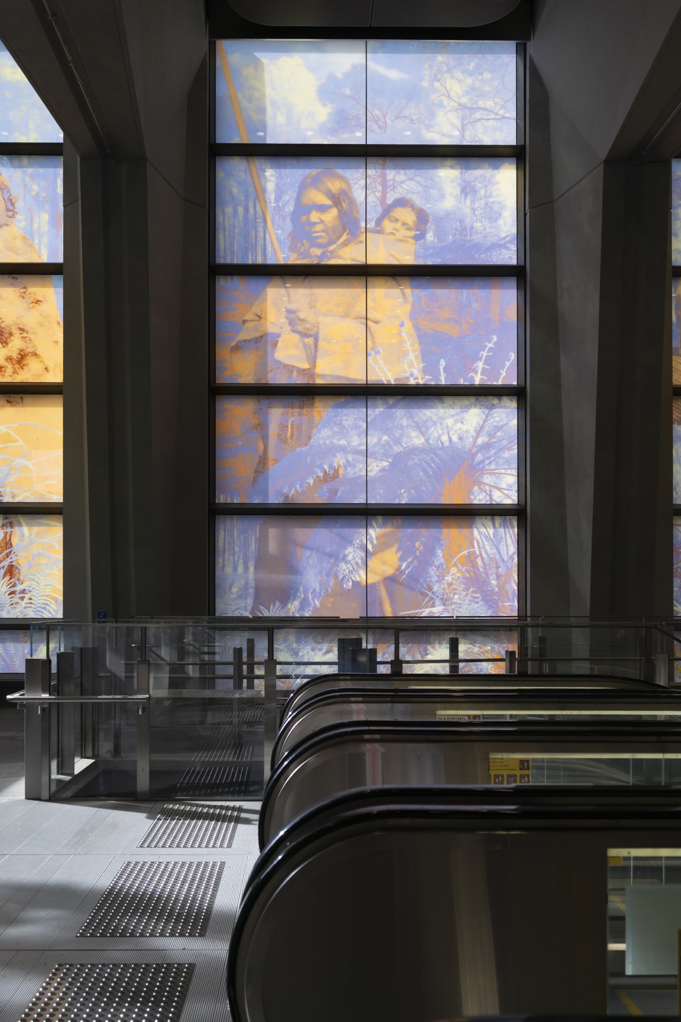 Forever by Danie Mellor's covers the huge glass wall at the main State Library Station entrance on the corner of Swanston and La Trobe streets.